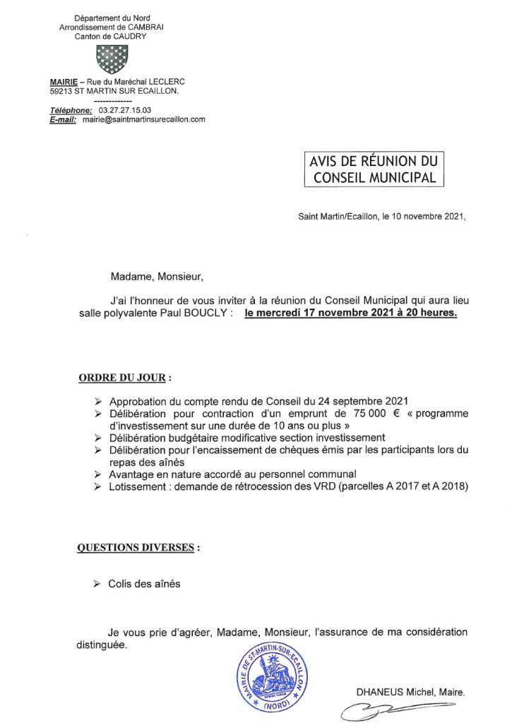 Invitation à la réunion du conseil municipal du 17 novembre 2021
