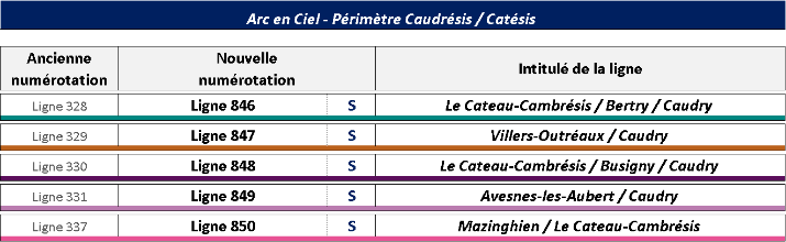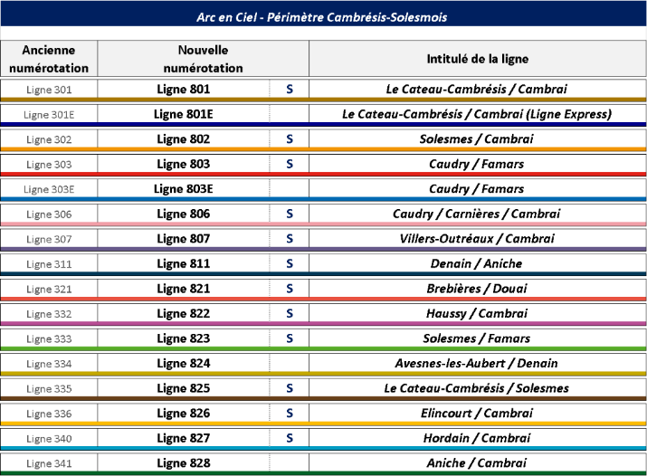 A l’occasion de la prochaine rentrée de septembre 2021, le réseau Arc en Ciel – Périmètres Cambrésis-Solesmois & Caudrésis-Catésis adopte la nouvelle numérotation des lignes régionales.